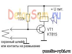 Если же порвать охранный провод, или разомкнуть контакт, база окажется подключенной к источнику питания через резистор R1, транзистор откроется и сработает реле (или сирена). Выключить ее можно только либо отключив питание, либо восстановив охранный шлейф.