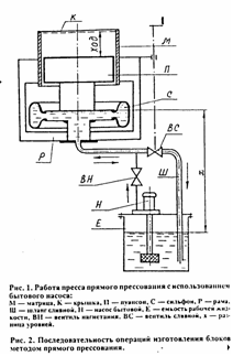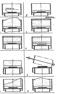 При изготовлении простых блоков операции а и б (см. рис. 4) могут отсутствовать. При изготовлении более тонких изделий типа черепицы на пуансон предварительно укладывают вкладыш со штампом-печатью необходимой толщины (брусок размерами 200x400x90 мм). Ни крышке крепят обратный штамп-печать. Изделие вынимают со вкладышем, с ним переносят, и после укладки на "созревание" вкладыш может снова многократно использоваться.