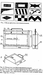 Резиновые штампы-печати (см. рис. 3), если нужно сделать большую серию однотипных блоков, можно приклеивать к пуансону клеем "Момент" или ему подобным. Если штамп представляет собой сложный рисунок с маленькими деталями, эти детали приклеивают на целый лист по размерам пуансона. Для облегчения съема готового изделия контуры резиновых деталей штампа должны иметь уклоны (края резиновых деталей вырезаются с уклонами). Смазка штампов не требуется. Если резиновые штампы (печати) прилипают к изделию, это свидетельствует о том, что исходное сырье имеет повышенную влажность.