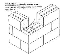 При использовании в качестве замков при кладке пазогребнеобразователей можно получать блоки, которыми можно производить кладку без применения растворов, так называемую "сухую" кладку (рис. 5), или при помощи "клеев" - растворов с соотношением "цемент: песок" - 1:2, сметанообразного состояния, которые наносят шпателем слоем толщиной 1-2 мм или обмакиванием. Поскольку основные размеры блоков достаточно строго выдерживают, то метод кладки из пазогребневых блоков может быстро освоить любой неспециалист-каменщик (правильному расположению блоков относительно друг друга способствует замок "паз-гребень"). Пример такой сухой кладки показан на рис. 5.