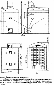 Дымовая труба делается высотой до 5 м (из кирпича) с внутренним сечением 40x40 см или из любой огнестойкой трубы 0 30-40 см. Труба устанавливается рядом с печью, с задней стороны печи (можно с одной стороны использовать заднюю стенку печи). Труба соединяется с печью дымовым каналом (сечением 40х30см), который делается в верхней части задней стенки печи. На середине высоты укладки в стенках печи устраивают смотровые отверстия (25x15 см), которые после просмотра закладывают кирпичами и замазывают глиной. Кладку печи производят, учитывая необходимость частичной ее разборки при укладке и разборке садки. Боковые стенки, свод, задняя стенка, труба, а также угловые части передней стенки кладут на обычном глинопесчаном растворе. Та часть передней стенки, которая будет разбираться для разделки садка, укладывается без раствора. После заделки проема кирпичом стенка обмазывается глиной.