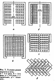 Укладку сырца в печь (рис. 7) производят так, чтобы в первых 3-4 рядах уложенного кирпича просветы между ними были (для кирпичей, расположенных непосредственно вблизи топки) 10-15 мм, а по мере удаления (от топки дальше) увеличивались до 25 мм. Ряды можно укладывать любым способом, например, "решеткой" или "елочкой". Способы можно чередовать. Нужно помнить главное: каждый кирпич должен быть доступен обтеканию его дымовым газам. Расстояние между кирпичами садка и стенками печи должно быть в пределах 20-25 мм.
