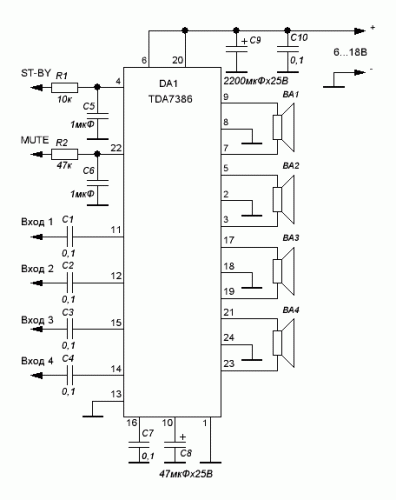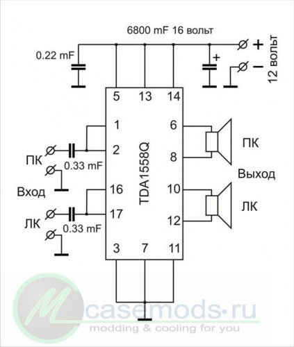 6800 мкФ. Отогнутые вниз выводы 3, 7 и 11 так же спаиваются вместе