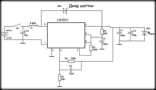 В этой схеме все гораздо сложнее, и она прекрасно подходит для стационарного варианта лазера! В драйвере используется микросхема LM317, которая включена стабилизатором тока. См рисунок.