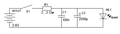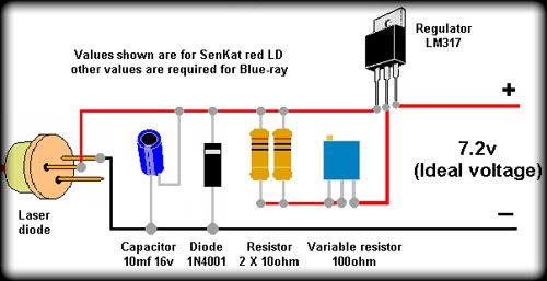 Теперь время подумать о питании нашего лазера. ЛД питается примерно от 3V и потребляет 200-400мА в зависимости от мощности(скорости привода). Лазер это не лампочка! Ни в коем случае не подсоединяйте его напрямую к батарейкам! Без ограничительного резистора его быстро убьют и 2 батарейки от лазерной указки! ЛД нелинейный элемент, поэтому питать его надо не напряжением, а током! то есть нужны токо ограничивающие элементы.