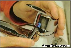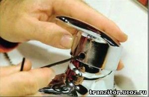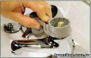 3. Сняв ручку смесителя, сначала отворачивают декоративную, а затем - накидную гайку, с помощью которой картридж плотно прижат к седлу смесителя. Декоративная гайка легко отворачивается рукой, а для отворачивания накидной гайки используют специальный ключ. При отсутствии последнего гайку можно отвернуть и обычным газовым ключом.
