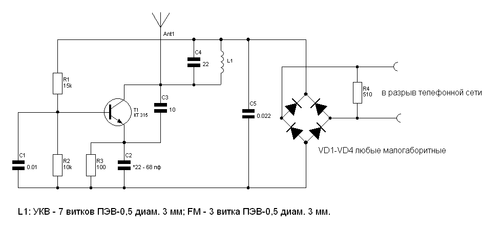 Малогабаритный телефонный жучок, подключается в разрыв одной жилы телефонной сети. Сигналы принимаются с помощью радиоприёмника в УКВ или FM диапазонов. Радиус приёма до 200м.