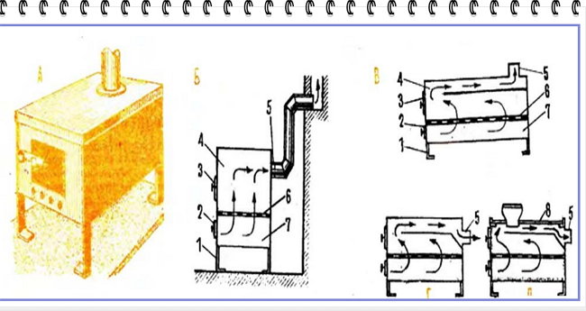 (А - простая печь, Б - улучшенная, В - печь со стальным листом, Г - с патрубком в задней стенке, Д - каркасная печь с чугунной плитой):