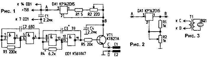 На рис.2 показана схема регулируемого источника питания (5...13 В). Генератор пакетов импульсов выполнен по традиционной схеме на микросхеме DD1 и особенностей не имеет. Номиналы RC-элементов высокочастотной части генератора могут быть откорректированы при настройке частоты в резонанс с частотой ультразвукового излучателя-активатора. Микросхема DA1 и транзистор VT1 должны быть установлены на теплоотводящих пластинах. Наиболее проблематичным в практической реализации УЗСУ является выбор ультразвукового излучателя-активатора и обеспечение его гидроизоляции при одновременном достижении максимальной отдачи энергии ультразвуковых колебаний в окружающую среду (жидкость). Обычно в качестве ультразвукового излучателя используют пьезокерамику - титанат бария, стронция, излучатели на ферритовых или пермаллоевых сердечниках, пьезокварцевые пластины (рис.3) [2-4], что открывает широкое поле для эксперимента. Одним из интересных вариантов получения ультразвуковых колебаний является просто пропускание импульсов электрического тока через воду с использованием системы близко расположенных электродов, подключенных к точкам А и В устройства. Периодическое прохождение импульсов тока между электродами вызовет акустическую электростимулированную модуляцию раствора. В качестве электродов можно рекомендовать алюминий или графит. При стирке должна быть обеспечена надежная развязка от питающей сети. Емкость для стирки (ведро, таз) должны быть удалены от заземленных предметов и установлены на сухом полу. Акустические колебания в стирающем растворе можно возбуждать и в диапазоне звуковых частот. Эксперименты показали, что стирка в таких условиях происходит с приемлемым по сравнению с прототипом результатом. Особенности стирки с применением УЗСУ - в стирающий раствор засыпают столько же стирающего порошка, как и при ручной стирке, температура воды должна быть порядка 65°С. Белье должно свободно плавать в растворе, изредка его следует помешивать деревянным щипцами. Сильно загрязненные участки белья рекомендуется дополнительно намылить. Процесс стирки длится 30...40 минут или более (в зависимости от КПД ультразвукового активатора). Полоскать белье можно также с использованием УЗСУ. Следует отметить, что опыт оптимального использования УЗСУ появляется после нескольких стирок.