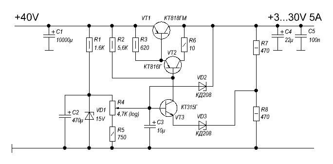 Схема применяется для блоков питания, для регулировки выходного напряжения, характеристики зависят от транзистора VT1 который устанавливается на радиатор. Защита от короткого замыкания. выполнена на транзисторе VT3, подойдет любой маломощный транзистор. Регулировка выходного напряжения осуществляется резистором подстроечным R4.