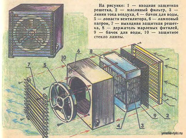 Воздух поступает в него через решетку, в масляном фильтре очищается от пыли, проходит через увлажнитель и через направляющую решетку подается в помещение. Осевой вентилятор (производительностью 300 куб. м./час) иногда шумит, что раздражает. Для снижения шума в электрическую схему вентилятора п