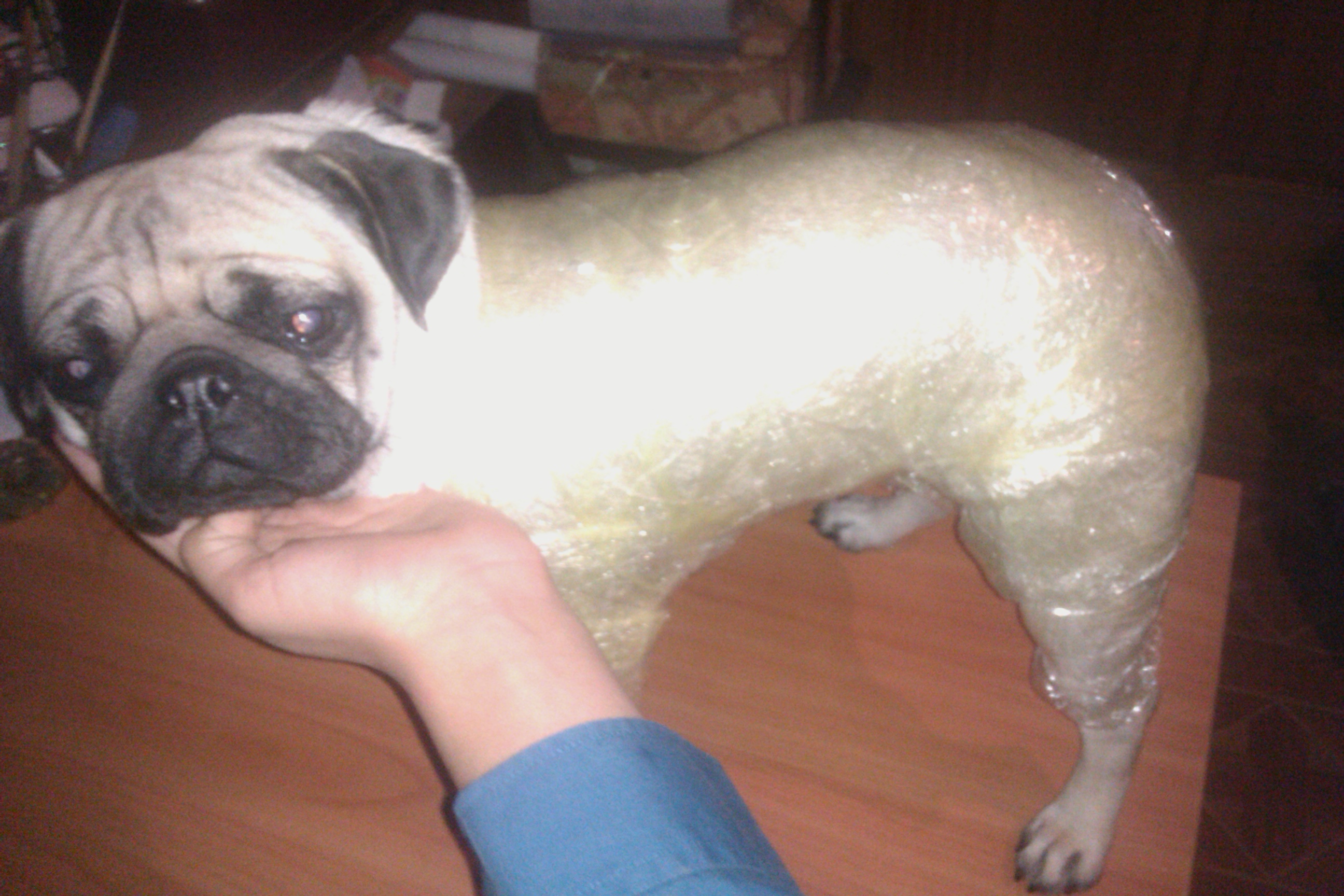 1. Обматываем нашу фигуру пищевой пленкой без "пробелов" не беспокойтесь, (собачке не больно)))) она просто в шоке, такого с ней еще не делали)
