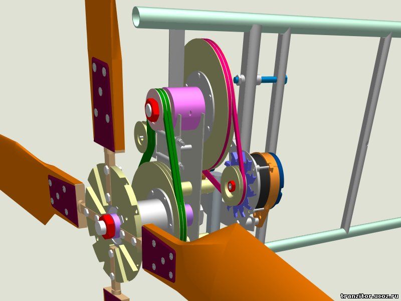 Несколько слов о пульте контроля и зарядки аккумулятора. В него входят амперметр и вольтметр постоянного тока любого типа, но лучше небольших размеров. Амперметр на максимальный ток 20-30 А, вольтметр на 15-30 В (из расчета того, что бортовая сеть автомобиля - 12 В). Развязывающий диод - любого типа на ток 20 А. В качестве реостата можно использовать проволочное сопротивление типа ППБ-50Г на 5-10 0м, 50 Вт с доработкой: с левого края нужно снять несколько витков провода, чтобы в рабочем положении цепь разрывалась. Можно использовать и любой другой резистор, выдерживающий ток 20 А в течение нескольких секунд. А нужно это вот зачем: если аккумулятор заряжен полностью и напряжение на нем достигло 14-14,5 В, то резистором в течение трех секунд закорачиваем генератор и тем самым останавливаем его, ток при этом в 3-4 раза меньше рабочего. Можно затем одну из лопастей привязать к мачте. Закорачивать генератор резко нельзя, так как может произойти поломка механизма. Вручную, даже при среднем ветре, за лопасть останавливать очень опасно. Уменьшать этим резистором ток заряда тоже нельзя, так как он выгорит через несколько десятков секунд. Ток заряда можно уменьшить путем добавления количества включенных в розетку ламп. Токоведущий провод - любой мягкий кабель (лучше обрезиненный) сечением 3-4 мм?, который пропущен внутри трубы мачты. Эксплуатация ветроэлектростанций в течение 10 суток даже с двумя лопастями показала, что этой энергии достаточно: ведь ветер на море почти каждый день. В качестве электрогенератора отлично подходят различные автомобильные и тракторные генераторы. Отличные лопасти получаются изготовленные по авиамодельной технологии с круткой (для сохранения постоянного шага) - Лонжерон и пенопластовым наполнитель, всё обклеено стеклотканью на эпоксидке. Но это уже усложнение, хотя эффективность вырастет на 20%. Ниже представлена конструкция ветрогенератора с двумя генераторами.