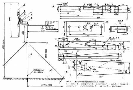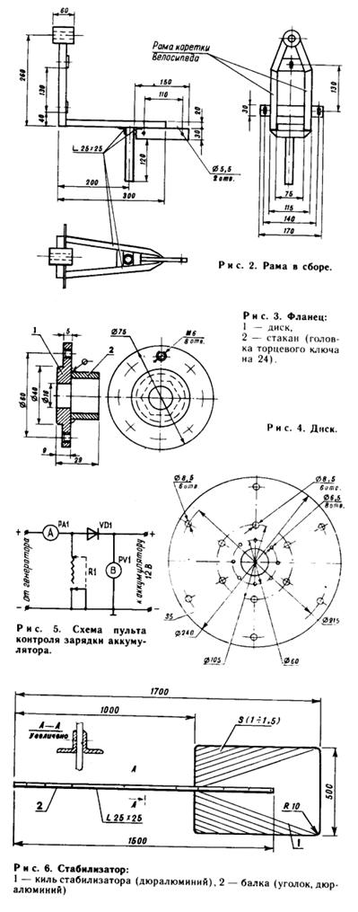 Я хочу предложить читателям интересное на мой взгляд и полезное устройство - портативную ветроэлектростанцию. В летнее время я с семьей часто отдыхаю на берегу моря. Каждому понятно, что отдых становится значительно комфортабельней, если есть источник электроэнергии. После изготовления ветряка отпала необходимость в экономии бортовой сети автомобиля, появилась возможность постоянно пользоваться магнитолой, освещением, телевизором, а во время даже небольшого ветра - автомобильным холодильником. Мною были изготовлены несколько вариантов ветроэлектростанций. Предлагаемый сейчас наиболее прост и доступен. В качестве генератора, основного агрегата любой электростанции, используется электродвигатель постоянного тока (U=48 В, 1=15 А, п=1200 об/мин). Ротор вращается с частотой менее 500 об/мин, причем по мере усиления ветра обороты не возрастают, а увеличивается ток заряда. На валу генератора установлена цепная звездочка (Z=10) от велосипедного двигателя Д-6. Ведомая звездочка (Z=48) и весь кареточный узел взяты от взрослого велосипеда. Раму пришлось распилить и придать ей нужную форму, а потом заварить. Генератор крепится к раме при помощи болтов М8. Роликовую цепь с шагом 1 2,7 мм перед установкой нужно прокипятить несколько минут в моторном масле, а затем вытереть ветошью. Лучше использовать цепь от мотоцикла: ее срок службы значительно дольше.  Вал каретки я выточил новый, более длинный. При сборке кареточного узла необходимо смазать подшипники смазкой <Литол-24> или ЦИАТИМ. Затем на вал навинчивается до упора гайка М16, надевается фланец (рис.3) и зажимается другой гайкой. К фланцу восемью болтами Мб крепится диск (рис.4) таким образом, чтобы выступ фланца 0 40 мм вошел в отверстие диска. Фланец изготавливается следующим образом: на токарном станке из стали вытачивается диск (рис.3, поз.1), затем головка торцевого ключа на 24 отрезается со стороны держателя по высоте до 20 мм, обе эти детали совмещаются друг с другом соосно и привариваются. В таком случае, если будут использоваться только две лопасти, диск и фланец можно заменить стальной пластиной (рис.1, поз.3). Лопасти изготавливаются из дюралюминия толщиной 2 мм. После изготовления им необходимо придать дугообразную форму. Для этого лопасть надо положить на что-то круглое (например, трубу диаметром 8ОО мм и длиной не -менее 800 мм) и согнуть по линии, показанной на чертеже. Затем лопасть при помощи шести шурупов крепится к деревянной спице, которая делается из струганного деревянного бруска 36х55х500 мм. Спицы, в свою очередь (при помощи двух болтов М8 каждая), присоединяются к диску или пластине. Для использования слабого ветра, 5-8 м/с, у меня сделано шесть одинаковых лопастей. При сильном ветре советую использовать только две. Но даже и при небольшом ветре с двумя лопастями ветряк дает ток 4-6 А при напряжении 14 В. В принципе, можно уменьшить длину лопастей до 80 см. К нижней части рамы приварен штырь (кусок трубы длиной 120-150 мм), который с небольшим зазором входит в трубу-мачту. Перед монтажом его необходимо смазать и проложить латунную шайбу, на которой весь узел будет легко вращаться в горизонтальной плоскости и при помощи съемного стабилизатора становиться против ветра. Мачта длиной 3-3,5 м изготовлена из водопроводной трубы d 34 мм (не менее). К нижней части мачты, с торца трубы, приварена опорная площадка (S 2-3 дм?