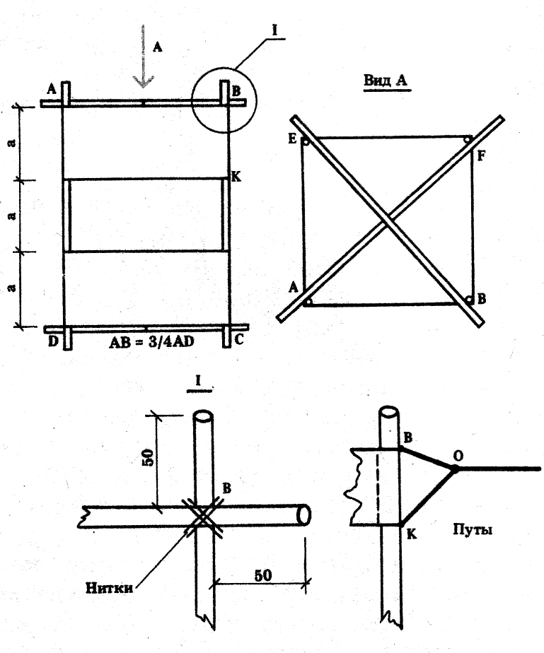 Все рейки изготавливают на 100 мм больше их рассчитанной длины для того, чтобы каждая рейка своими концами выступала на 50 мм за узел крепления реек между собой. В месте крепления рейки перевязываются крест-накрест крепкими нитками, которые затем промазывают клеем. Готовый каркас обтягивается полосами ткани или полиэтиленовой пленки. К рейкам ткань или пленка обязательно приклеивается или даже пришивается (а лучше сделать и то и другое), иначе обшивка может сползти под напором ветра.