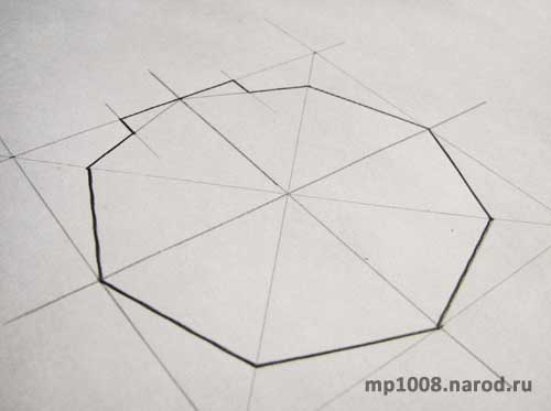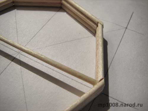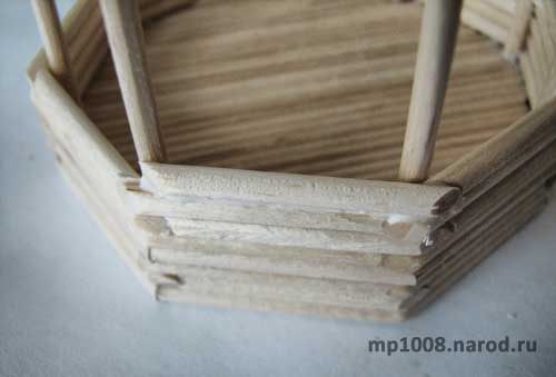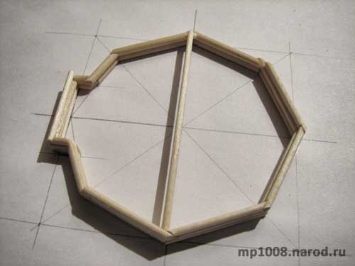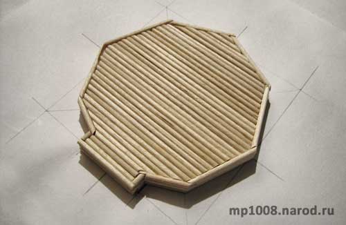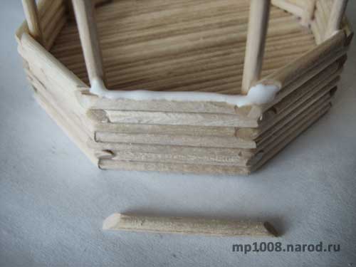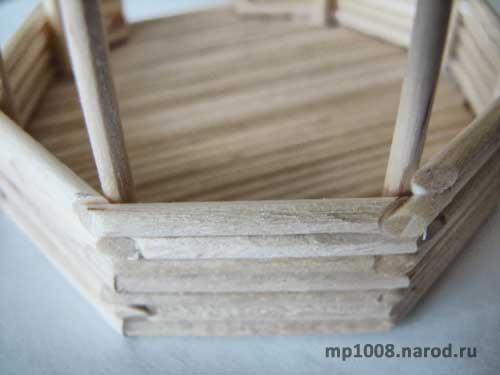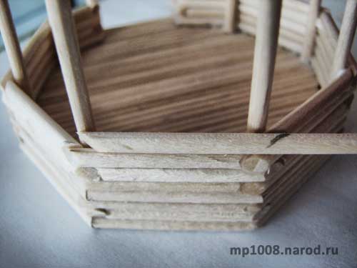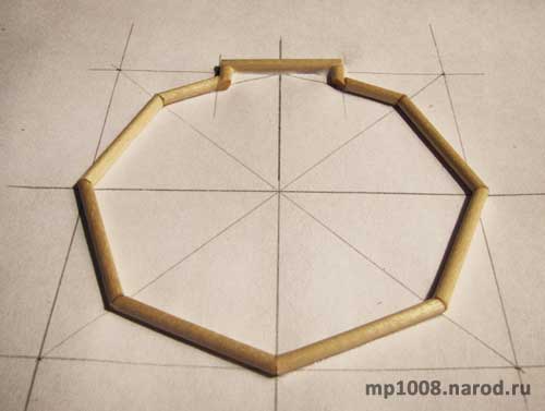 Шаг 9. Прежде, чем приклеить палочки на место, необходимо изготовить удерживающее их кольцо. Для этого собираем внутри нашей беседки, прямо на полу, новое кольцо. Оно должно располагаться внутри внешних венцов и повторять контуры восьмигранника. На следующих фото (шаг 11) можно рассмотреть это удерживающее кольцо и будет понятно, как его сделать. Необходимо только обратить внимание, что при его склейке надо быть осторожным с клеем. Ибо, если его налить слишком много, то кольцо после высыхания будет не снять с места сборки.