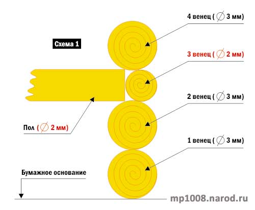 Шаг 6. Таким образом, настилаем весь пол, подгоняя палочки по длине и укладывая их одну к другой. Снаружи торцы половых палочек видны не будут (Схема укладки 1).