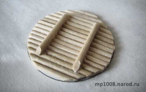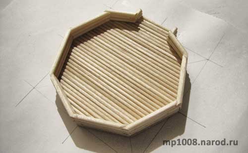 Шаг 21. Строим столешницу. Рисуем круг на бумаге и вырезаем палочки по его размеру. Для прочности можно приклеить две поперечные палочки. Большой проблемой может стать клей, который попадет под палочки и приклеит их к бумаге. Поэтому аккуратно наносите его сверху и старайтесь, чтобы он не попал на бумагу.
