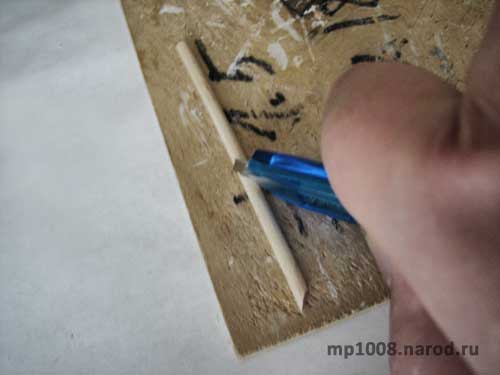 Шаг 15. Затем, на рабочей доске, которую не жалко, отрезаем в обозначенном месте ножом под определенным углом. Чем точнее будет угол, тем аккуратнее потом будет выглядеть все строение. Не бойтесь практиковаться. Если не получилось отрезать с первого раза, возьмите другую палочку и пробуйте снова. Отрезал – примерил, отрезал – примерил. И так до тех пор, пока результат вас не удовлетворил.