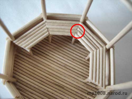 Шаг 5. ...и прячется за следующий венец (из таких же тонких палочек).