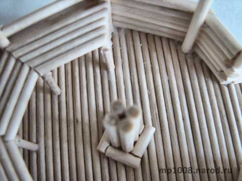 Шаг 20. Отмеряем и приклеиваем палочки для сидения скамьи. Я уже упоминал выше, что не стоит лениться в примерке. Если палочка не подходит, отложите ее или выкиньте. Возьмите и отмерьте новую. Результат неправильно отрезанной палочки может быть невидим поначалу, зато потом он будет сильно бросаться в глаза. По центру фото, прямо в середине скамьи виден результат некачественно подогнанной палочки. Она выбивается из дружного ряда. И это уже не исправить - клей высох. Я специально оставил эту кривую палку и не стал вырезать новую, чтобы наглядно показать, что может получиться, если не отмерить семь раз перед тем как клеить. Нестыковка в данном случае внутри беседки и не будет так сильно видна.