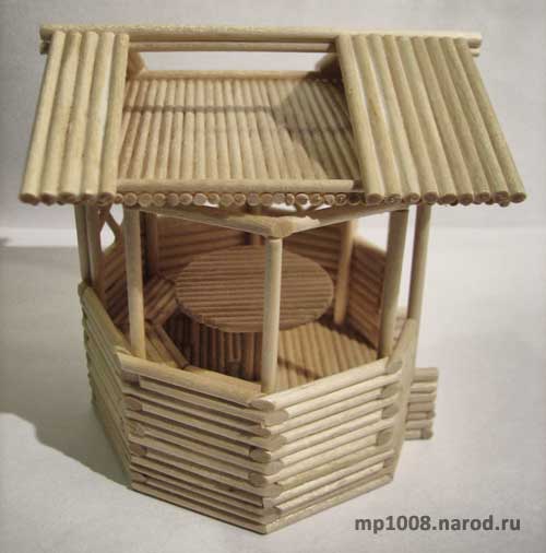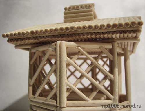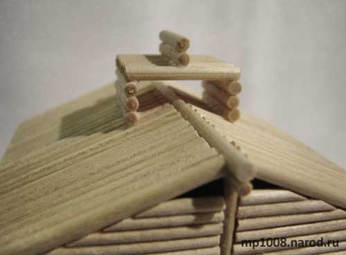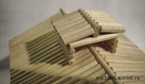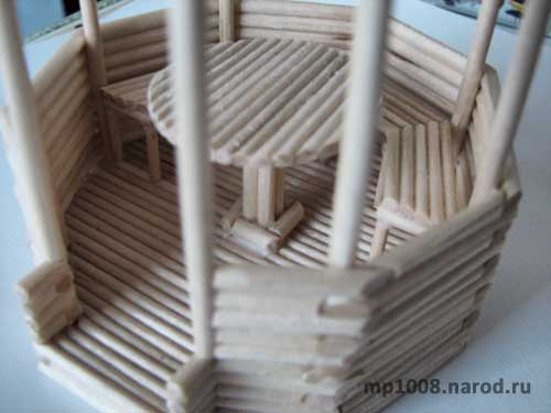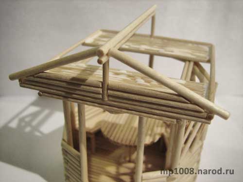 Шаг 27. Теперь создадим потолок. Отмеряем по ширине беседки и подсовываем под балку крыши палочки, образующие потолок. Склеиваем их между собой и балками крыши. На фото виден еще не высохший клей. Не бойтесь, в последствии от него не останется и следа.