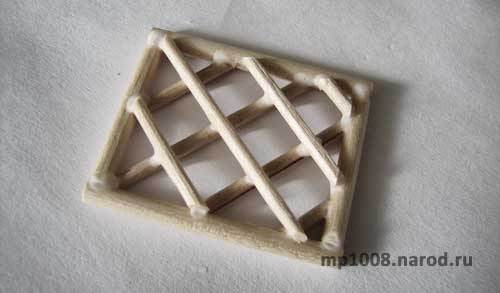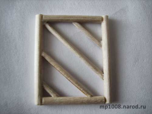 Шаг 24. Итак, окон у нас в беседке 6 и 2 узких высоких у входа. Будем закрывать шесть больших. Обмерьте первое окошко (любое, левое или правое крайнее), которое идет сразу за узким. Вырежьте палочки по габаритам окна. Затем склейте их, а внутри приклейте наискосок (под углом примерно в 45 градусов) более тонкие палочки. Я взял обычные зубочистки. Результат виден на фото выше.