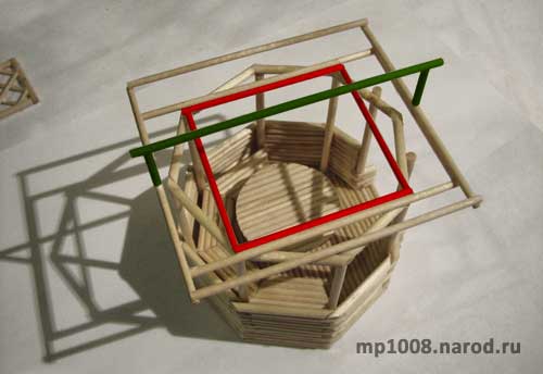 Шаг 26. Я сначала хотел сделать сложную многоугольную крышу. Однако потом передумал. Для первого раза пусть будет попроще. Так как я передумал делать сложную крышу уже после того, как приклеил первые необходимые для нее палочки, я не стал их отдирать, чтобы не испортить беседку. Их не будет видно. На фото эти ненужные элементы покрашены красным цветом. Клеить их в процессе создания беседки вам не нужно. Мы же приклеим другие, нужные нам палочки - они будут основой нашей крыши. Также приклеиваем опорную конструкцию посередине беседки (окрашена зеленым на фото), разместив ее опоры на балках-палочках со стороны входа и противоположной стороны.