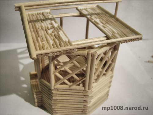 Шаг 34. Укладываем палочки параллельно крыше на построенное основание и получаем крышу для маленькой башни.