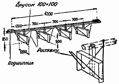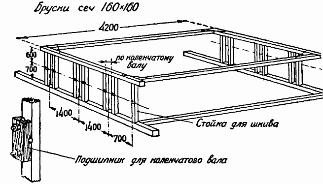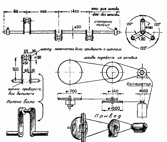 На реках со скоростью течения 0,8 метра в секунду и больше можно установить бесплотинный гидродвигатель нового типа. Принцип действия этого двигателя ясен из приложенных рисунков и схем. Под напором воды лопатки перемещают штанги, движение которых приводит во вращение кривошип. На его валу сидит шкив. Вращение шкива и передается генератору. Мощность двигателя зависит от скорости течения воды. В местах, где скорость течения небольшая, нужно сузить русло реки. Конструкция гидродвигателя, например на 3,5 киловатта, настолько проста, что его можно сделать в любом школьном кружке или мастерской МТС.