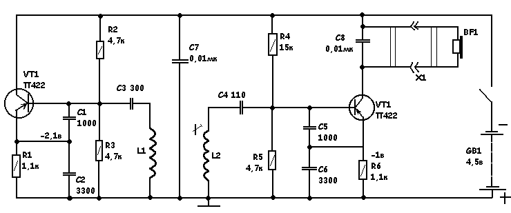 на двух транзисторах. Схема металлоискателя представлена на рис.1.