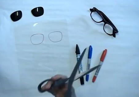 Прилаживаем вынутые стекла к пленке и обрисовываем по контуру маркером. После чего вырезаем новые линзы. Вместо пленки можно использовать бэйджик, коробку от музыкальных дисков или другую прозрачную пластмасу