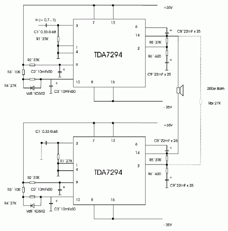 В данном усилителе применены две ИМС TDA7294, что позволило развить музыкальную мощность 200 Вт.