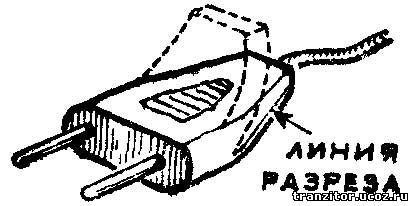 Отремонтировать неразборную вилку с обрывом провода в месте соединения с ней можно простым способом. Надо разрезать вилку по плоскости штырей, удалить остатки провода и припаять свежезачищениые концы. Затем склеить вилку и наложить ниточный бандаж.