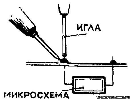 Когда вам необходимо выпаять из монтажной платы триоды, диоды,резисторы,микросхемы, важно не перегреть эти приборы. Для этого необходимо пользоваться старой иглой от капельницы или шприца. Конец ее заблаговременно обрезают. Иглу одевают на ножку микросхемы легко вращая её и касаются жалом паяльником места пайки. Когда припой плавится, а конец иглы легко одевается на ножку радиодетали. Это старый способ выпайки радиодеталей,которым до сих пор пользуются все мастера,выпаять микросхему из платы более просто и безопасно наверное невозможно