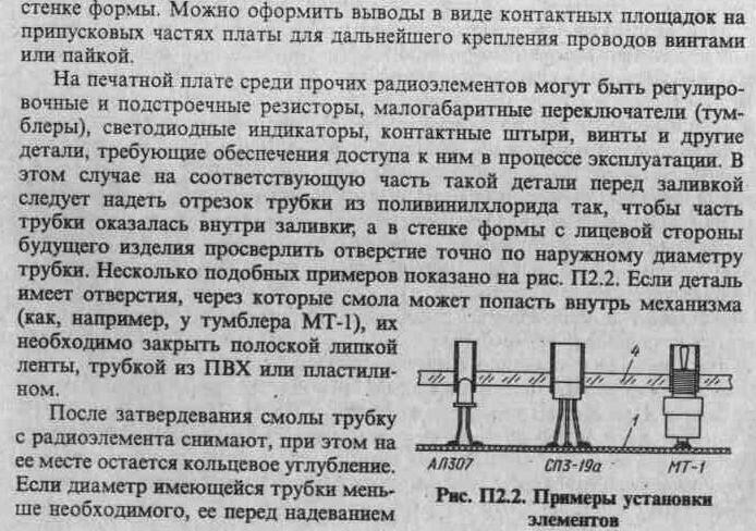 После затвердевания смолы форму разбирают, зачищают облой, снимают с выступающих радиоэлементов трубки. Хранившемуся в холодильнике остатку компаунда дают принять комнатную температуру и через дренажное отверстие в плате заполняют образовавшуюся раковину, после чего изделие оставляют еще на несколько часов для отверждения.
