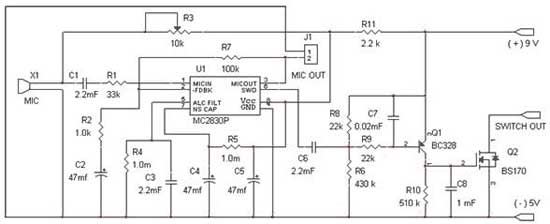 Схема, изображеннаяна рисунке, выгодновыделяетсяотклассическогосхожихконструкций, главнымизъяномкаковыхявляетсябессилиераспознатьголос и шум. Это приводит к неправильным срабатываниям. Этасхема в значительнойстепенилишенааналогичныхизъянов. В качестве активатора употребляетсямикросхема МС2830, далееформированныйсигналпоступаетнакоммутатор, собранныйна транзисторах Q1, Q2. Засчётразличий в речевых и шумовых формахволнысхемавключаетсянаголос и неактивируетсянашум.