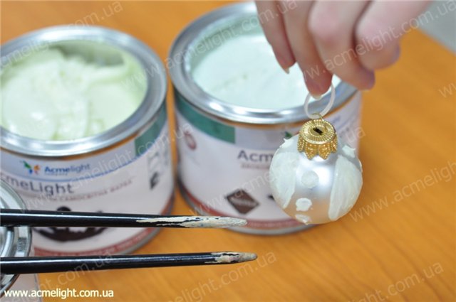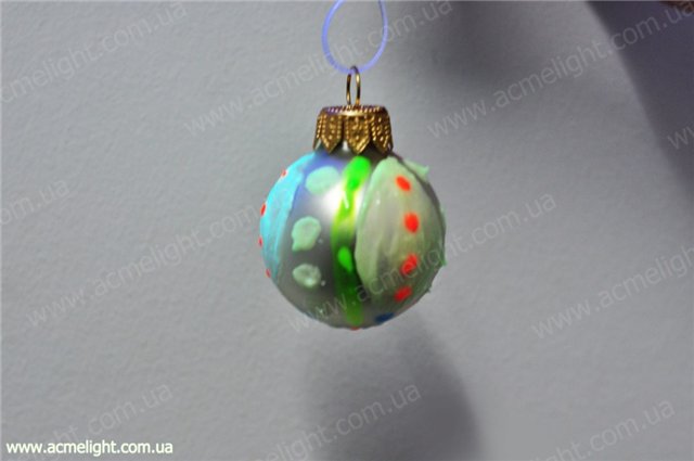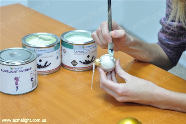 Для работы понадобиться: кисти, самые обычные елочные игрушки, светящаяся краска Acmelight Plastic.