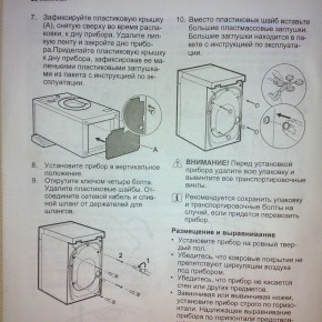 Как видно из инструкции написанной хохлами на русском языке, мне было необходимо извлечь из машины ШАЙБЫ. После удаления болтов на задней стене машины красовались 4 резиновых втулки. При попытке их вытащить я понял что они закреплены более чем основательно. Я решил их оставить на месте и не использовать пластиковые заглушки. Первое включение без белья (для промывки системы) показало практически бесшумную стирку и выполнение машиной всех предусмотренных функций. Но когда очередь дошла до отжима, с машиной начали происходить чудеса. Стоявшая как вкопанная стиральная машина, начала издавать звук, характерный для взлетающего самолета и перемещаться по полу. Первая мысль которая пришла в голову - "забирайте свое детище и верните деньги!". Так я и начал свой диалог позвонив в магазин где мы решали какую купить стиральную машину. В ходе диалога выяснилось следующее: - если я уверен в том что машина НЕ РАБОТАЕТ В СООТВЕТСТВИИ С ЗАЯВЛЕННЫМИ ХАРАКТЕРИСТИКАМИ, то я за свои деньги обеспечиваю доставку стиральной машины в магазин, где техническая комиссия оценит ее пригодность. По заключению этой комиссии и будет принято решение, вернуть мне деньги или нет. Я, разумеется, сослался на закон о защите прав потребителя. На что получил категоричный ответ, исключающий двойное трактование. Не поверив представителю магазина , начал штудировать интернет. И вот что я выяснил в результате. Стиральные машины не подпадают под группу товаров народного потребления, которые можно просто поменять по причине того что она вам не подходит. К сожалению, это не ботинки, которые можно вернуть в магазин без объяснения причин, почему они вам не подходят. При покупке стиральной машины, в случае возврата вам придется доказывать что она не пригодна к использованию. В противном случае, продавец в праве вам отказать, что он разумеется и сделает. Поняв что мы стали заложниками законодательства и не желая мириться с проблемой, я заказал вывоз стиральной машины на техническую комиссию. Так как у меня оставалось два дня до момента когда ее заберут, я решил попробовать устранить неполадки самостоятельно. Все таки фраза содержащаяся в тексте относительно удаления ШАЙБЫ, меня настораживала. Пришлось взять пассатижи и достаточно варварским методом удалить эту "шайбу"