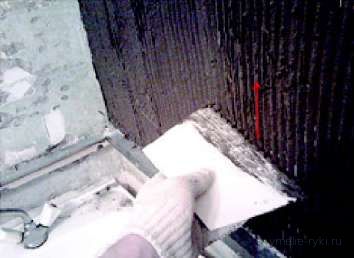 Возьмите зубчатый шпатель и проведите им снизу вверх. Получатся вот такие борозды. Сделайте так по всей ширине раствора. Когда мы проводим шпателем по стене, то он собирает лишние и оставляет только борозды глубиной до 8мм. На такую поверхность плитка будет хорошо клеиться.