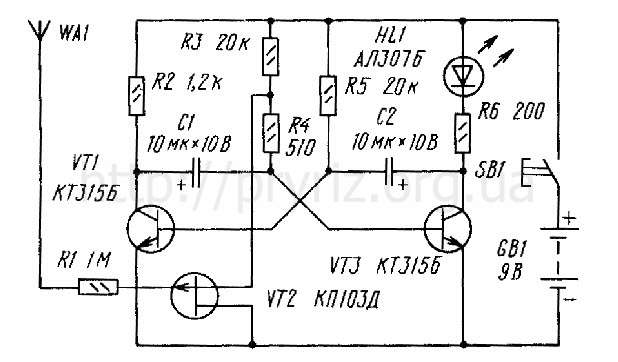 светодиод. Перемещая антенный щуп вблизи стены, нетрудно проследить за