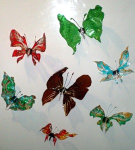 Бабочки очень симпатично и натурально выглядят изготовленные из ярких пластиковых бутылок Вырезаются бабочки и расскрашиваются красками. Можно использовать бисер, блестки и другие украшения Такие бабочки украсят ваше окно, поселившись на шторах создадут уют и завершённость дизайна вашей комнаты. Чтобя они легко цеплялись к шторам можно прикрепить их на неведимки или пару магнитиков или простую булавку.