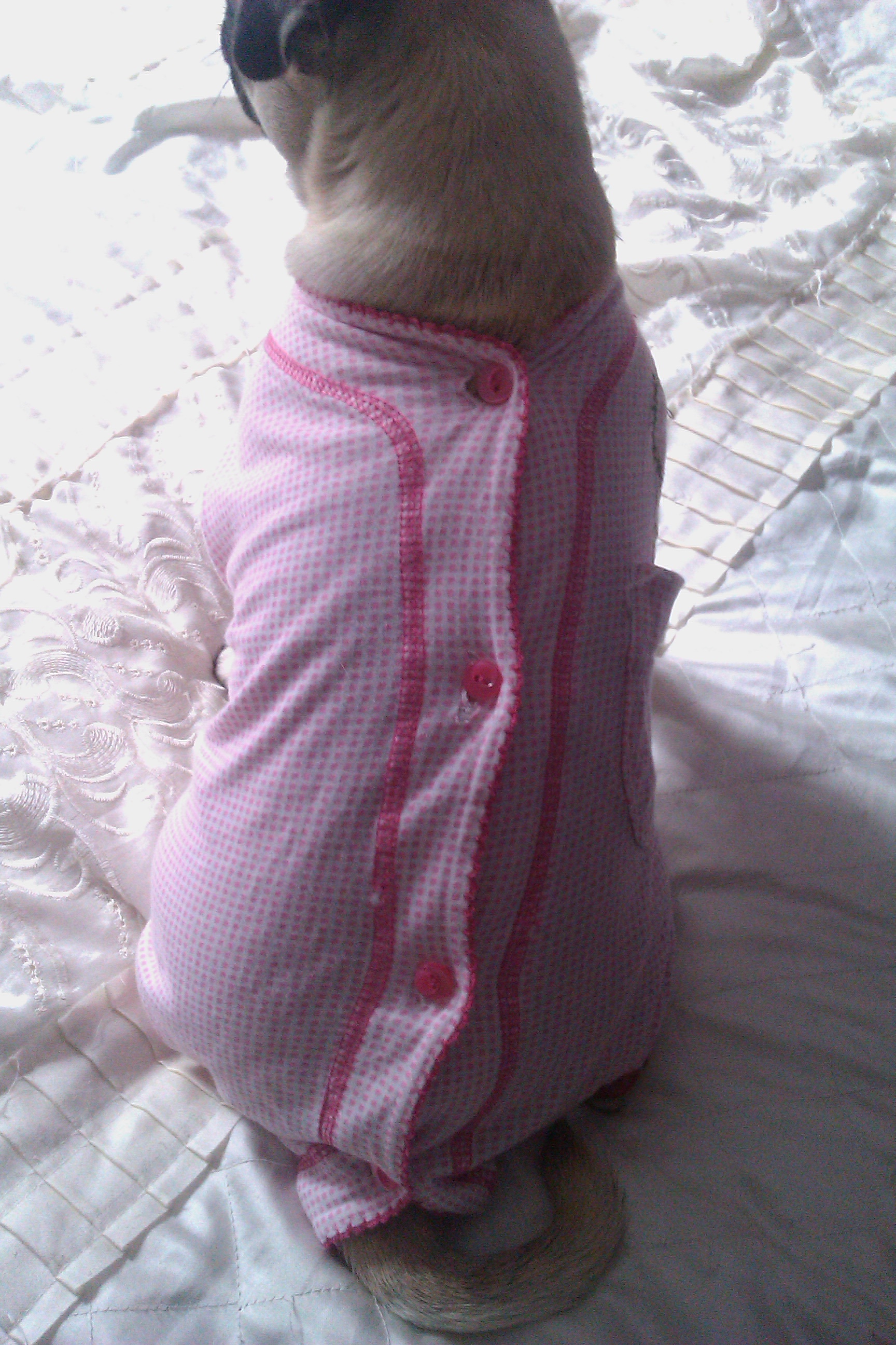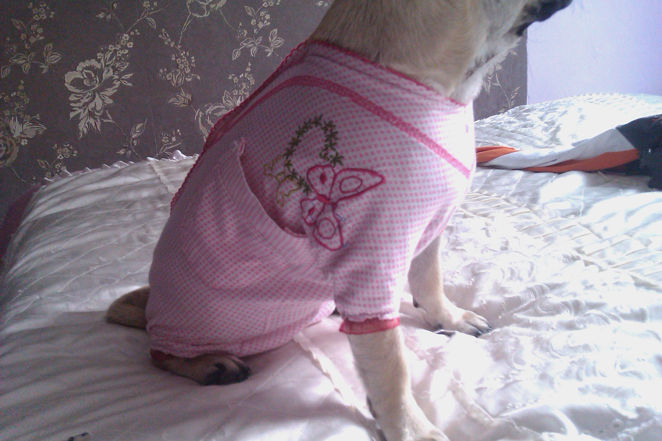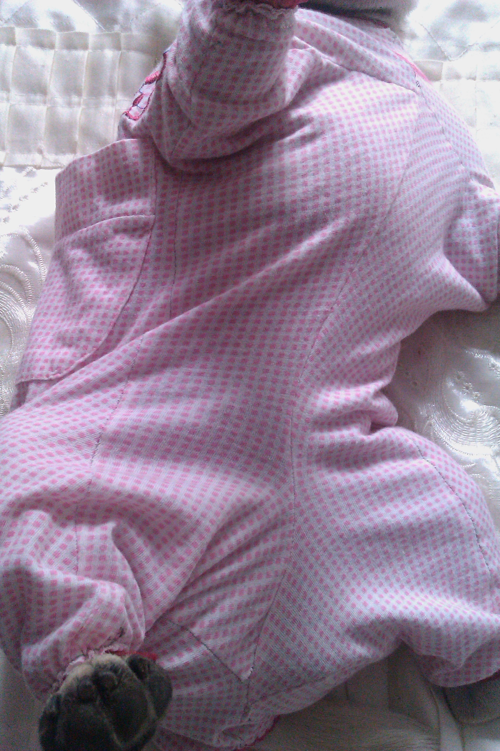 Вот какая пижама получилась у меня, хотя я и прибавила по 2 см. к выкройке, она все равно получилась тесновата, но Вам советую сделать по-свободней и добавить около 3-4см. Первый пробный вариант я сшила из своей старой пижамы, поэтому сгиб на спинке был уже с пуговицами, воротничком, бабочкой , кармашком и с красивым отверстием для хвостика. Резиночки я нашила на рукава, но можно и без них.