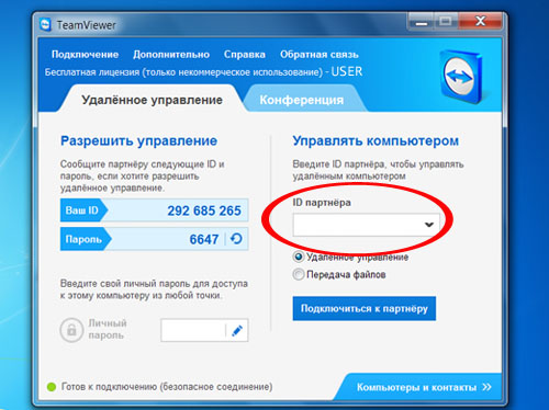 Если вы планируете подключится удаленно к другому компьютеру то, как уже упоминалось, на параллельном ПК должна быть запущена эта же программа. В зависимости от того кто к кому подключается нужно ввести следующие данные. Если вы подключаетесь к оппоненту, то он вам должен сообщить его ID адрес, который нужно ввести в соответствующее окно. Далее нужно будет выбрать цель подключения "Удаленное подключение" или "Передача файлов" и нажать кнопку "Подключиться к партнёру".