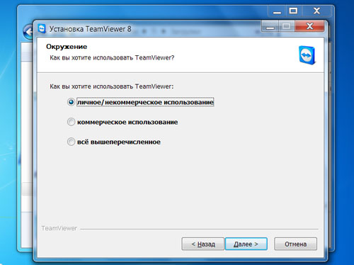 Переходим к следующему окну установки. В нем нудно выбрать вариант как именно вы собираетесь использовать эту программы, в каких целях. Должны заметить, что бесплатная версия программы TeamViewer только в случаи личного использования. В случаи коммерческого использования компании нужно будет приобрести лицензию за которую нужно заплатить. Продолжаем установку нажав "Далее"