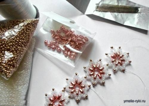 - Приступаем к заключительной части этого элемента. Теперь нужен для работы приготовленный мелкий бисер золотого цвета. Продеваем иглой через первую и вторую белые бисеринки первой петли (из четырех штук) пропускаем золотую и продеваем леску в третью и четвертую бисеринки этой же петли.