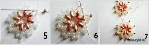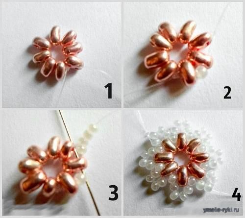 - Снова набираем бисеринку белого цвета и проводим те же манипуляции (рис. 2-3). Итог этой роботы на рис.4.