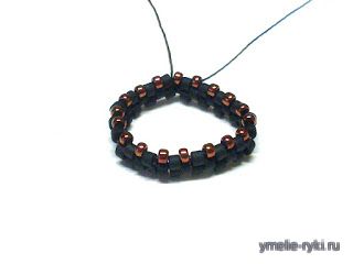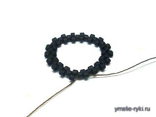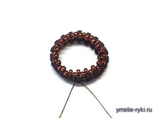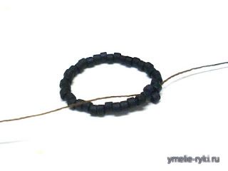 3. Что бы узел не был заметен вводим конец нити в ближайшую бисеренку и нанизываем на нее новую бисеренку такого же вида. Пропускаем остаток нити через следующую бисеренку кольца.