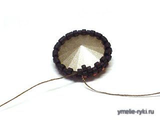 7. Вставляем Риволи вот таким образом. Обратная. острая сторона должна быть там, где бисер Delica. Продолжаем плести ряд мозаичным плетением.
