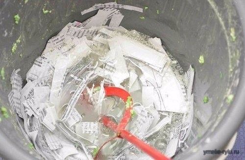 Бумагу можно нарезать, порвать или использовать целые листы и складываем в водро. Всю макулатуру заливаем подготовленною водой и оставляем размокать минимум на час, но если постоит подольше то это только улучшить результат.